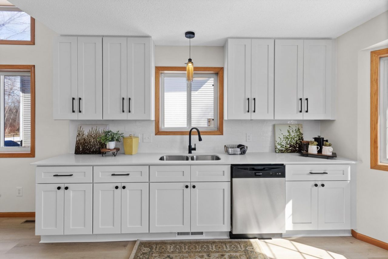 Updated 4 bedroom, 2 bathroom, three level split with fresh paint and new LVP flooring throughout. The main level welcomes you with tall ceilings in the entry and dining area, creating a bright and open feel with plenty of natural light. The kitchen features new cabinets, countertops, backsplash, and stainless steel appliances. Upstairs, recessed lighting was added to brighten the living room, which overlooks the dining area as well as provides access to the rear deck with a beautiful pond view. Down the hallway is a refreshed full bathroom with a new vanity, toiled, mirror and fixtures. Three bedrooms, including the primary suite with a private 3/4 bathroom. The lower level offers a spacious family room, a fourth bedroom, and a walkout to the fenced backyard, providing great indoor and outdoor living spaces. The clean utility room provides extra storage space and room to build an additional bathroom.